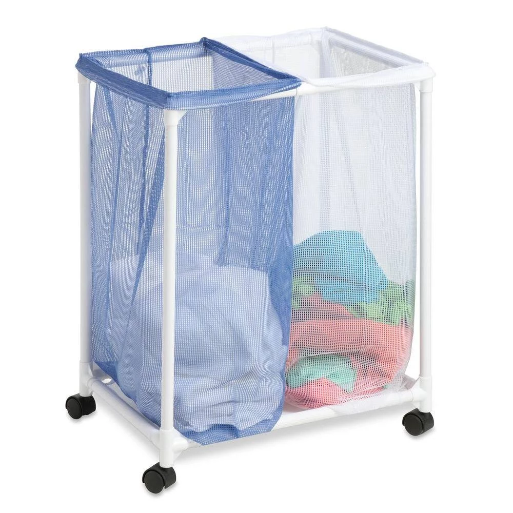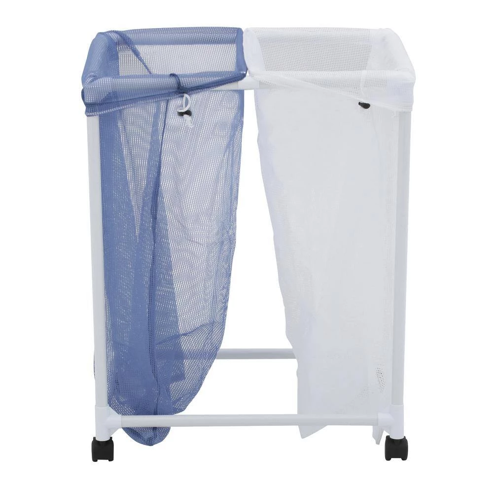 2-Bag Mesh Rolling Hamper, White / Blue. An economical laundry solution, this rolling hamper has two compartments to make sorting laundry a breeze. Sturdy, washable mesh bags let clothing breathe and helps keep mildew at bay. Bags are removable and feature a drawstring closure that prevents spilling and doubles as a carrying strap making them quick and easy to transport. Smooth rolling casters on a PVC frame make this sorter light and easy to maneuver. Whether you’re going all the way to the laundromat or just down the hall, this mesh laundry sorter will get you there in comfort and style. Color: White / BlueSome assembly required With stringent quality control methods, Honey-Can-Do confidently offers a limited lifetime warranty on every product they make.
