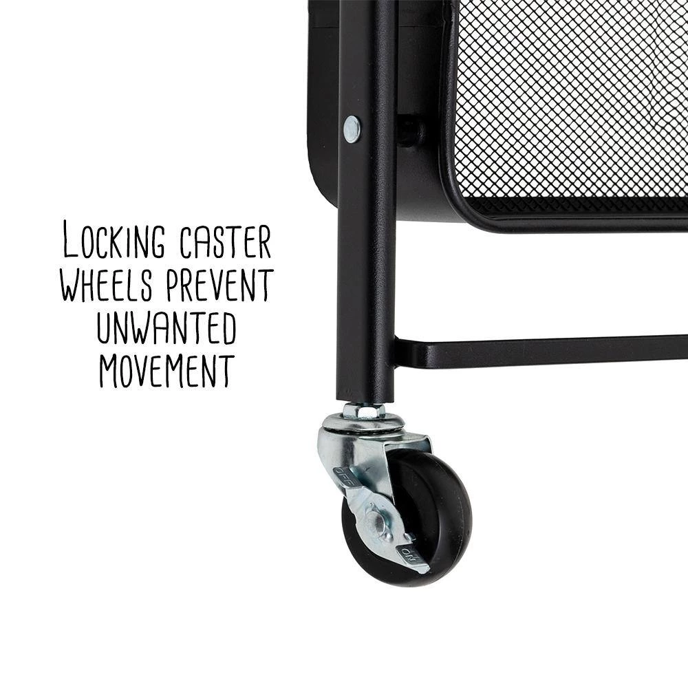 - Metal tray shelves with mesh design keep everything in place when the cart is in motion