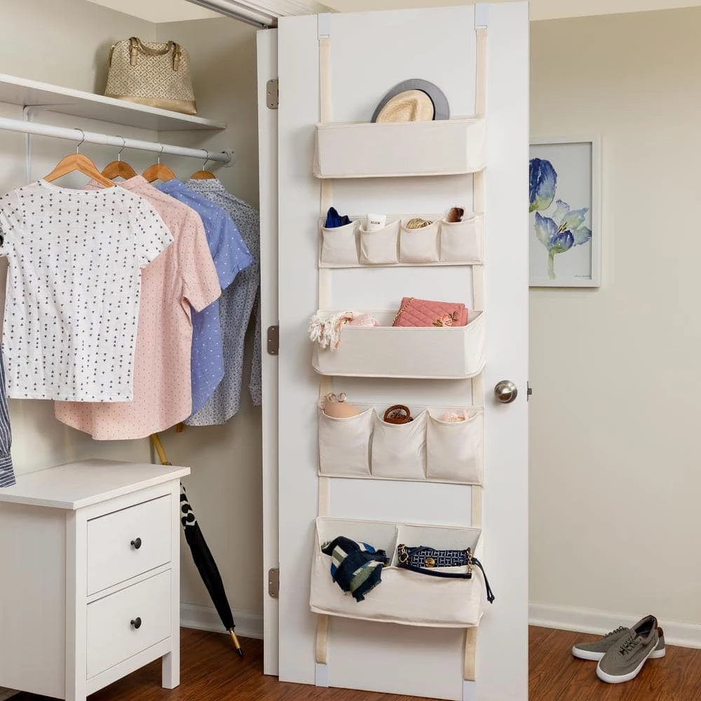 No matter what you need to store behind your door, this over-the-door organizer can handle it. With both small, medium and large pockets, and with cardboard panels in each for added support, this organizer can hold anything from shoes to hats to that trendy bag you just picked up at your local boutique.