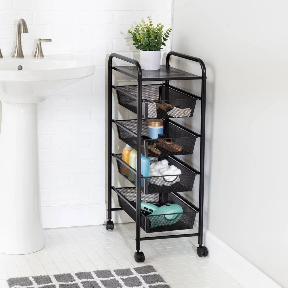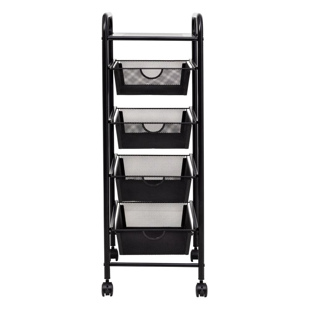 This black utility cart is ready to roll to the rescue and tackle your clutter. Its 4 metal drawers will effortlessly organize office supplies, toys, makeup, school supplies, tools, kitchenware, and more. Have items that need to be accessed frequently. The top tray has you covered, keeping everything from paintbrushes to hairspray in arm’s reach. On top of its storage superpowers (or should we say below), it also has a set of 4-wheels that make this an ideal portable storage solution. So whether you want to stash this black rolling cart away in a closet or wheel it into another room, all it takes is a little push.