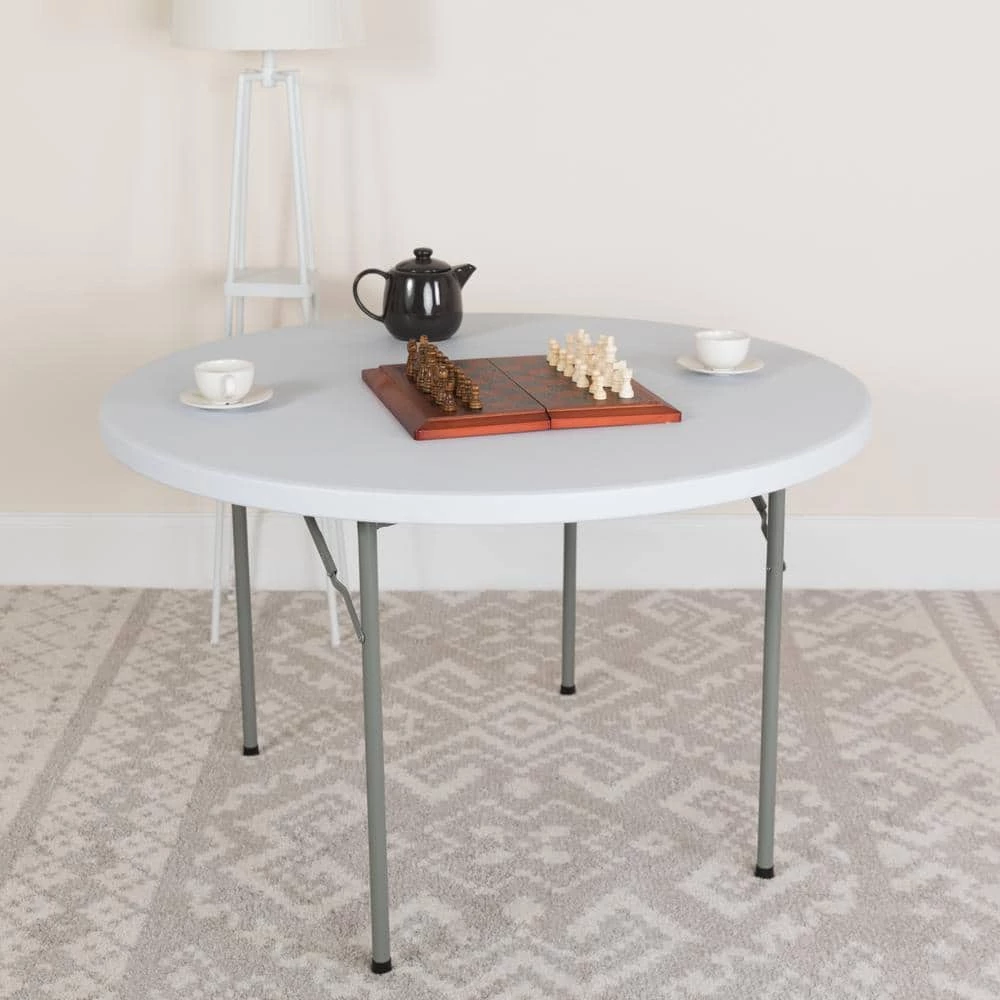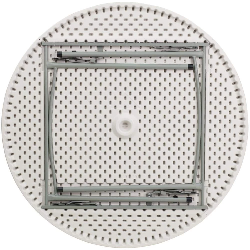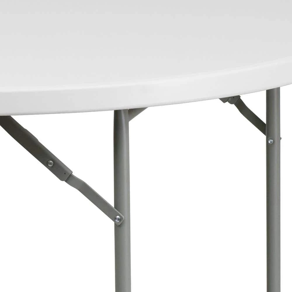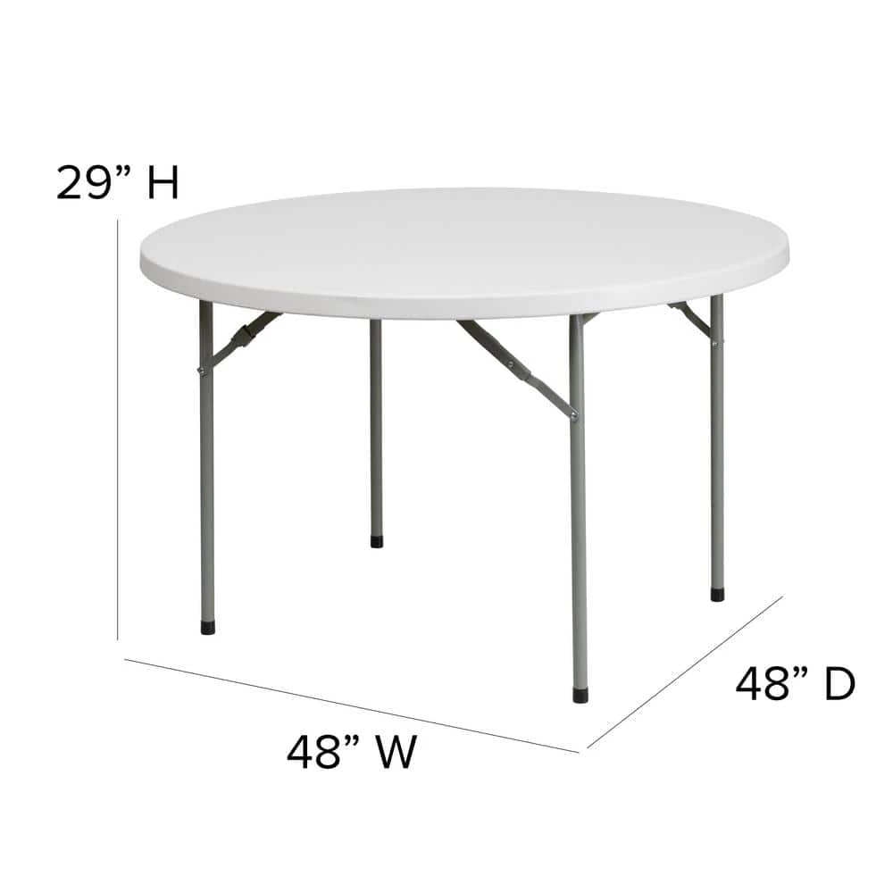 This round folding table is 4 ft. long and is beneficial in a multitude of settings that include banquet halls, conference centers, cafeterias, schools and in the home. The table can be used as a temporary seating solution or be setup for everyday use. The durable blow molded top is low maintenance and cleans easily. The table legs fold under the table to make storage more convenient and for better portability. This table is commercial grade to withstand everyday use in the hospitality industry.