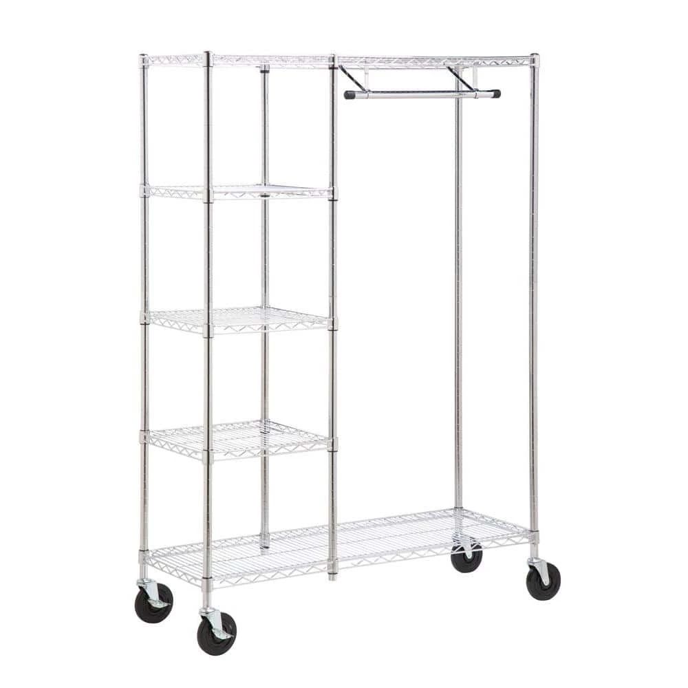 Create visible, accessible storage space instantly with the Honey-Can-Do Heavy-Duty Chrome Urban Valet with Wheels. The contemporary chrome finish and sturdy steel frame offer the perfect blend of style and functionality. Durable enough for the mudroom, garage or basement, the multi-use valet serves as both a shelving unit and garment rack, with rolling casters to ensure easy mobility around your space. Supporting up to 600 lbs., the valet also features adjustable shelves and is easy to assemble without any tools needed.