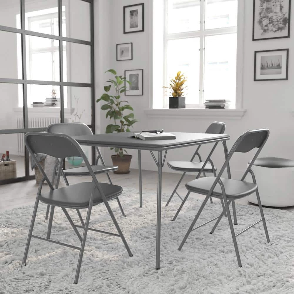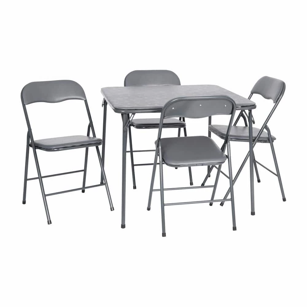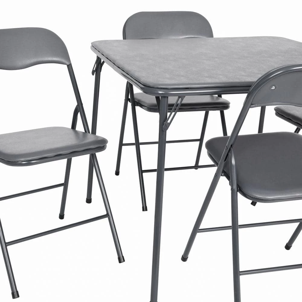Host all those upcoming events with ease when you have this 5 Piece Folding Card Table and Chair Set. This set is a convenient solution for times when you have more guests than table settings. This folding card table is the perfect size for card and board games to get the family involved or to host game night. The 5-piece set includes 4 metal padded folding chairs and a square folding table. The tabletop is padded to help slow down thrown cards from sliding off the table. Powder coating protects the legs from scratches while plastic floor glides protect your floor by sliding smoothly. This classic set comes in handy when you need additional table settings for family get-togethers or for poker night in the man cave. It can be used indoors or outside and is lightweight and easy to fold up, transport and store.