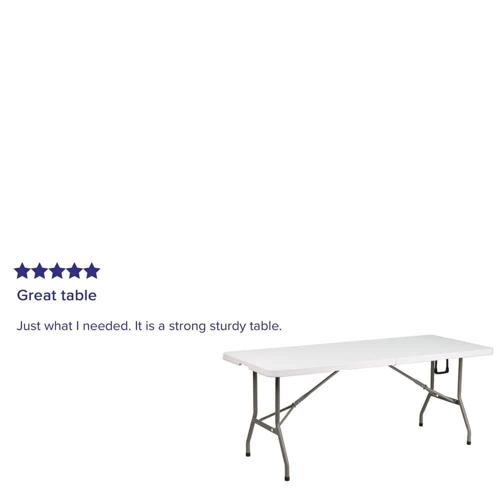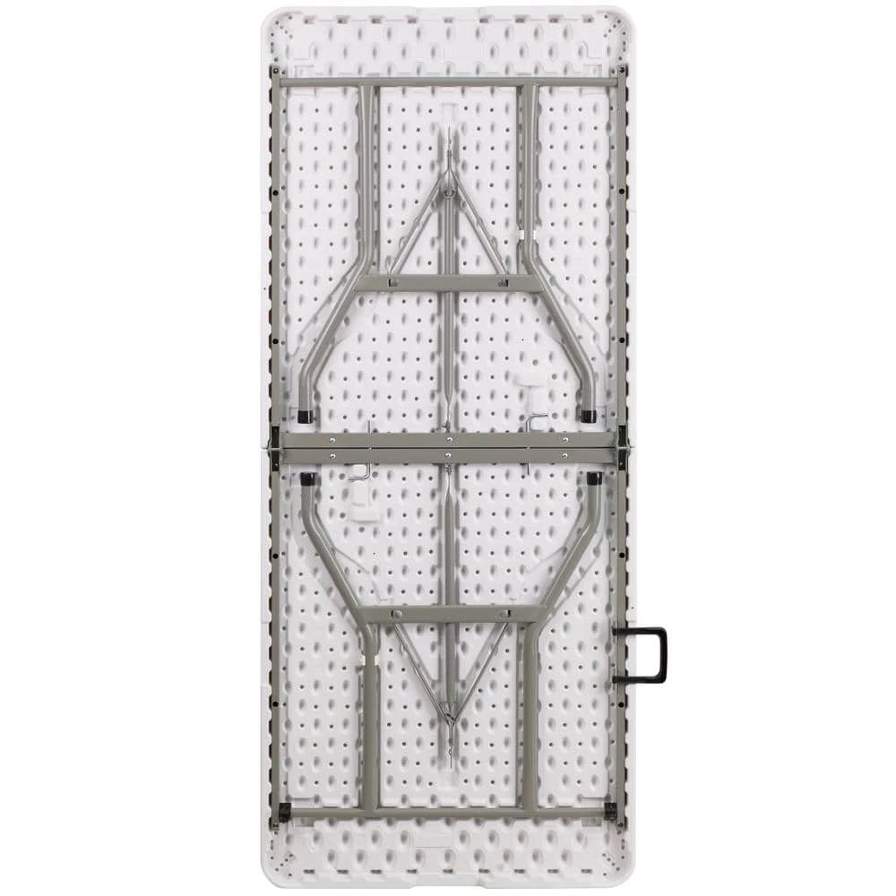This bi-fold plastic folding table is a great option when you need a temporary dining surface or an everyday workstation in your home or office. This versatile folding table can be dressed up during holiday events, parties and arts and craft activities. Place multiple tables side by side or in rows to accommodate large party events. The waterproof, impact and stain resistant top has a 330 lbs. static load capacity and is commercial rated for use as a training table, in banquet halls and at trade shows. The tabletop is 6 ft. long, 1.75 in. thick, and will seat up to 8 adults. Attractive gray powder coated legs lock securely in place while in use and non-marring floor caps protect your floor by sliding smoothly when you need to move the table. This durable, easy to clean table folds in half, making it easy to store and transport, using the convenient carrying handle attached on the side. The 30 in. W x 72 in. L Bi-Fold Plastic Banquet and Event Folding Table with Carrying Handle is perfect for in-home events or on the deck or patio while entertaining during a barbeque. After your outdoor event, store the table indoors to protect the frame from extreme moisture. Rectangular folding tables offer the best solution for your home or business.