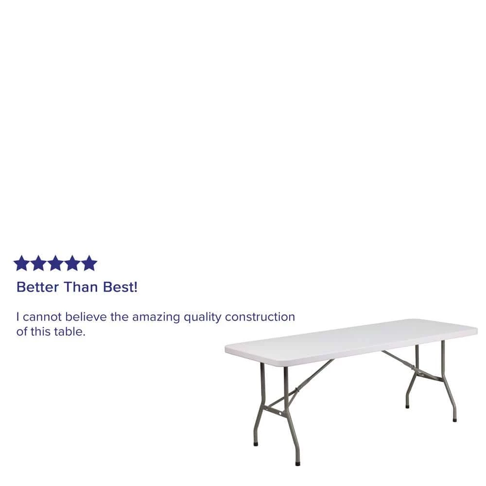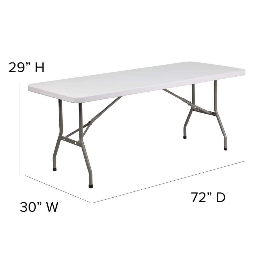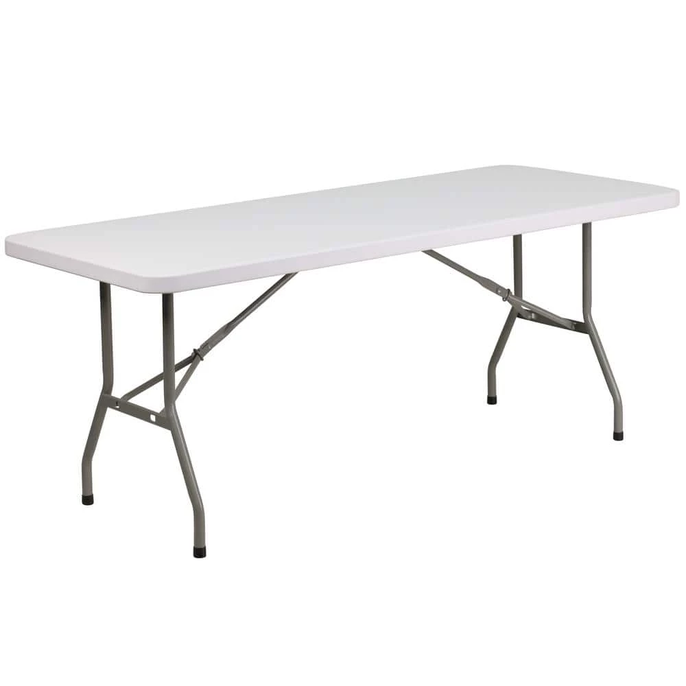 Ensure you have enough surface space for any function and take the stress out of hosting your next gathering. This rectangular folding table is 6 feet long and is beneficial in a multitude of settings that include banquet halls, conference centers, cafeterias, schools and in the home. Use as a temporary seating solution or setup for everyday use. This plastic folding table comfortably seats up to eight adults while ensuring plenty of legroom. Speed up the time it takes to set-up and tear-down wedding receptions, graduation parties, banquets, buffets and other events with this folding table. Whether you’re hosting an indoor or outdoor gathering, the smooth design is easy to wipe clean. When using for outdoor events store indoors to protect the frame from extreme moisture. The table legs fold under for storage and provide better portability. This table is commercial grade to withstand everyday use in the hospitality industry.