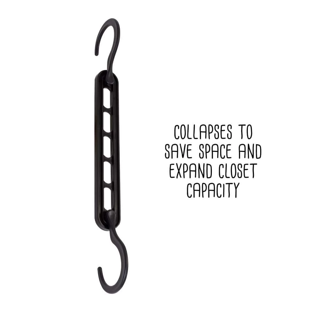 Great organization is flexible, adapting to different needs as situations change. And this collapsible hanger is certainly flexible. Depending on your needs, it can save closet space or showcase outfit options. If closet real estate is at a premium, collapse the hanger so it’s hanging from a single hook, cascading up to five garments. If you have space and prefer better visibility for possible outfits and options, hang both hooks on the closet rod, showcasing up to 10 items across the five slots. When seasons change, reach for this collapsible hanger. It can take up to 30 pounds of woolen sweaters and heavy coats and turn them into a neat, slim line at the back of the closet, opening up room for those breezy summer camisoles and dresses.