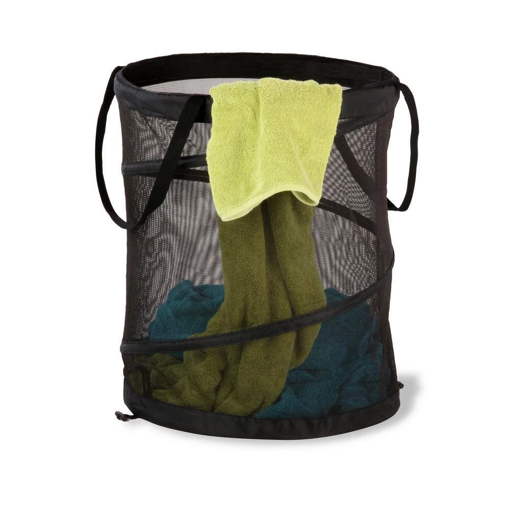 - Collapses into a slim circle when empty; pops back up to fill with dirty laundry