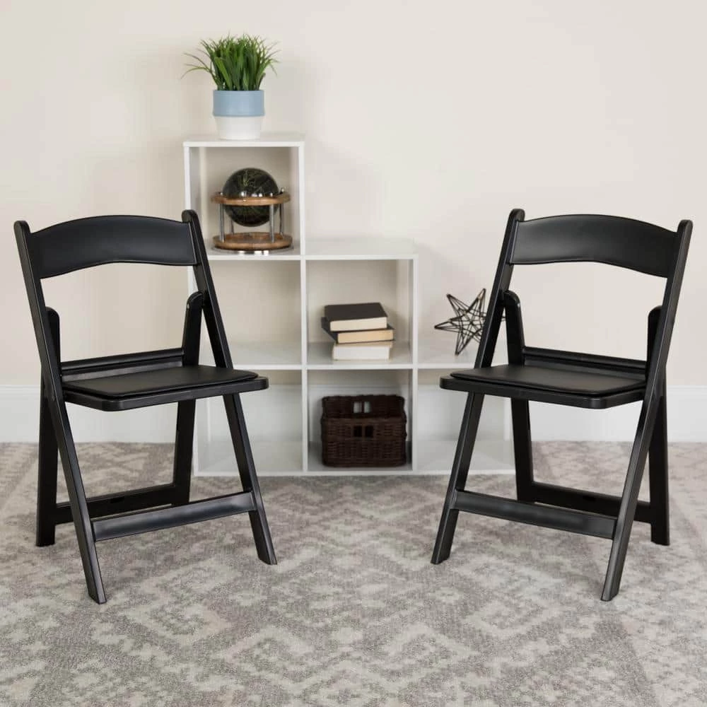 The Black Resin Folding Chair combines comfort and elegance that looks good at all your special events, whether it’s a backyard barbeque, a formal banquet or beach wedding. This chair is made from ultra-strong resin that’s very lightweight, yet extremely strong and can hold up to 1000 pounds making this portable folding chair perfect for any social event, your home office or remote learning space. The smooth frame is double braced for added stability and the front brace can be used as a footrest. The color of the frame is the same all the way through, so you don’t have to worry about nicks and scratches. No re-painting or staining is ever needed; your chairs will look great for years to come. The chair comes with a detachable, washable, waterproof seat cushion filled with fire retardant foam. The easy to clean, durable design of these chairs makes them the ideal choice for indoor and outdoor use. The chairs are portable and fold compactly to transport and store.