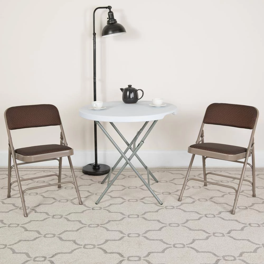 This classic metal folding chair with fabric upholstery is a convenient option for everyday use or when you need extra seating in an indoor or outdoor location. The comfortable seat and back are padded with 1 in. of foam and upholstered in fabric that complements the frame finish. Its 18 gauge curved steel frame is triple braced and double-hinged with leg strengthening support bars to hold up to 300 lbs. These chairs are portable and fold compactly to transport and store. Non-marring floor glides on the legs protect your floors by sliding smoothly when you move them. Designed for residential and commercial use, these attractive chairs are a smart seating solution for your next business meeting, family gathering or special event.