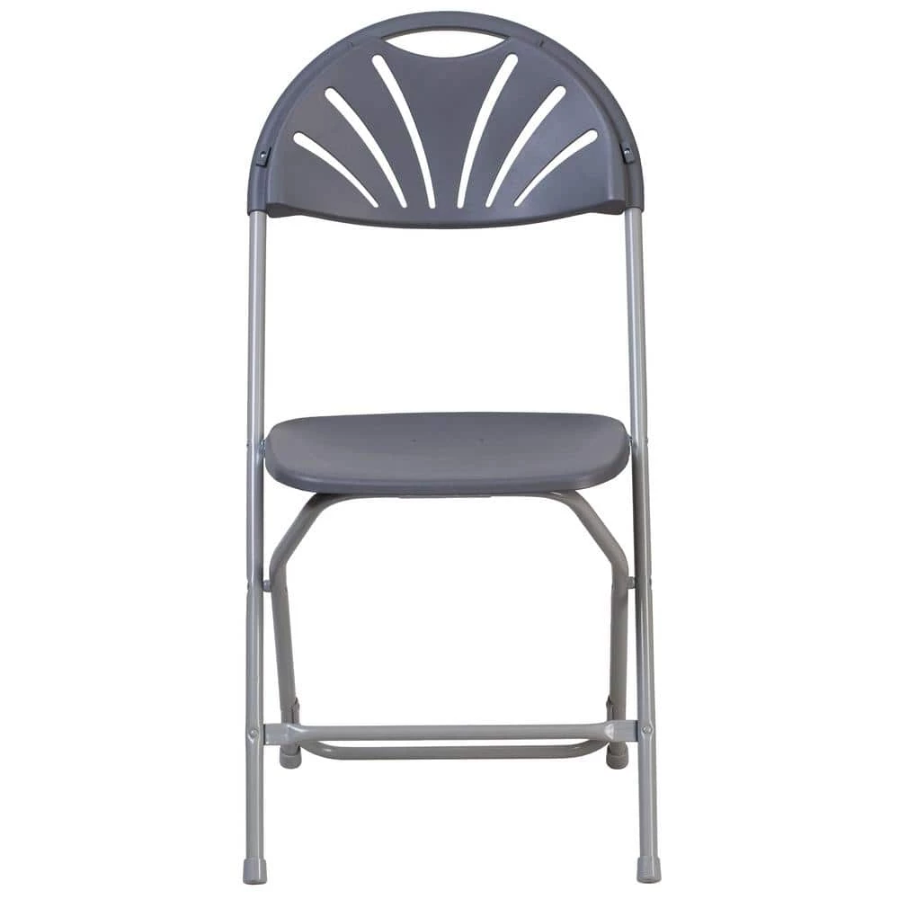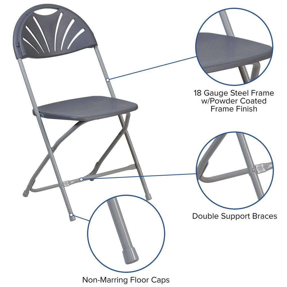 This elegant 650 lbs. Capacity Plastic Fan Back Folding Chair will provide a modern seating solution to any setting. These portable chairs fold compactly to stack/nest on top of each other or to easily transport from place to place. Fan back chairs are a great option for event planners as they can be used without the need of chair covers. The seat and back are textured and contoured for comfort. Drain holes in the seat keep water from pooling when the chairs get rained on. The 18-Gauge steel frame with leg strengthening double support rails gives this lightweight chair the strength to hold up to 650 lbs. Non-marring floor caps on the legs protect your floors from scuffs and scrapes by sliding smoothly when you move them. The versatile fan back banquet folding chair will be your go-to chair for indoor and outdoor party events.