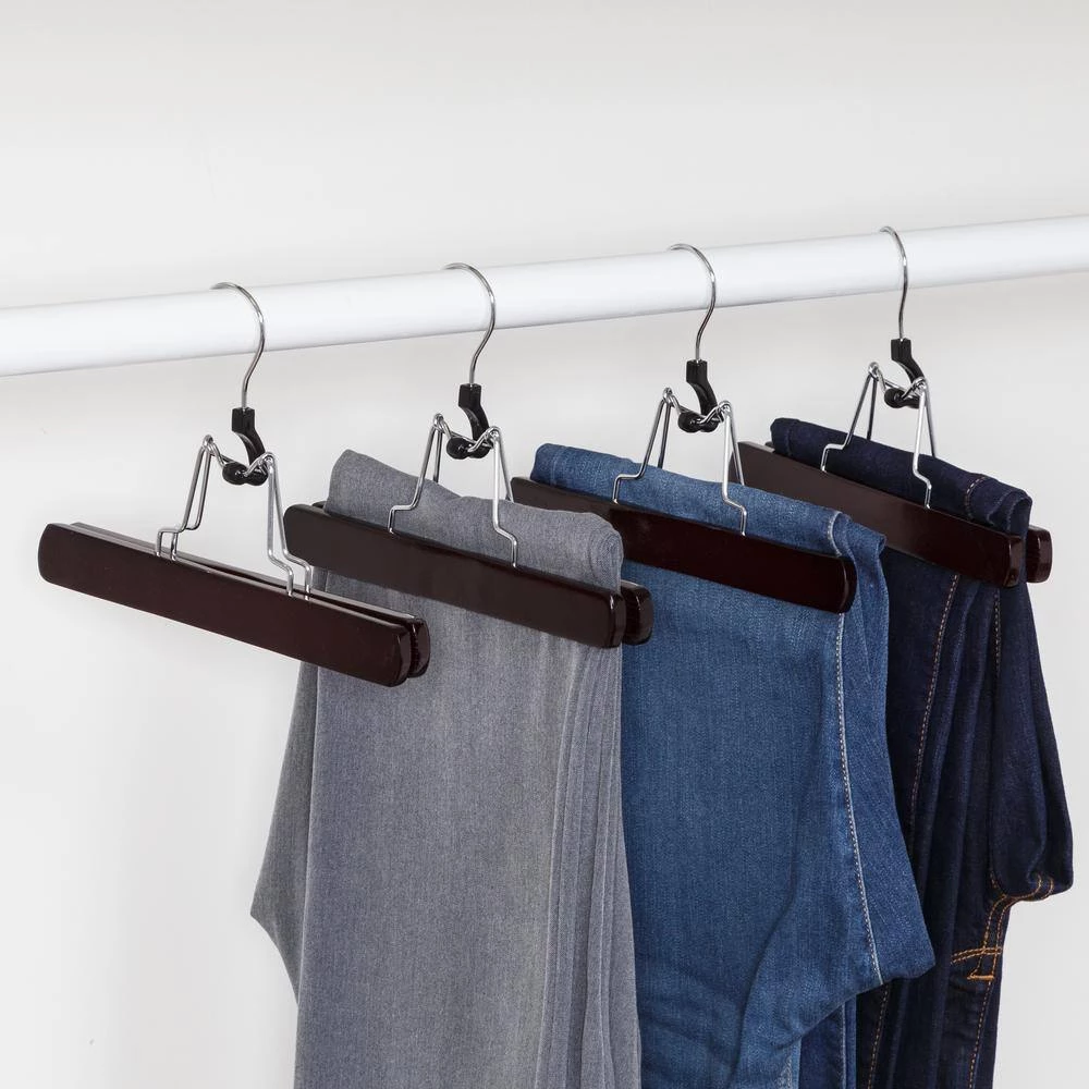 The beautiful deep cherry finish on these clamp pants hangers might be enough for you to swap out all your old pants. That clamp is strong enough to keep your thickest wool trousers secure, yet gentle enough not to leave an impression on the waistband. The hook swivels 360° so you can hang your garments anywhere you need them close at hand.