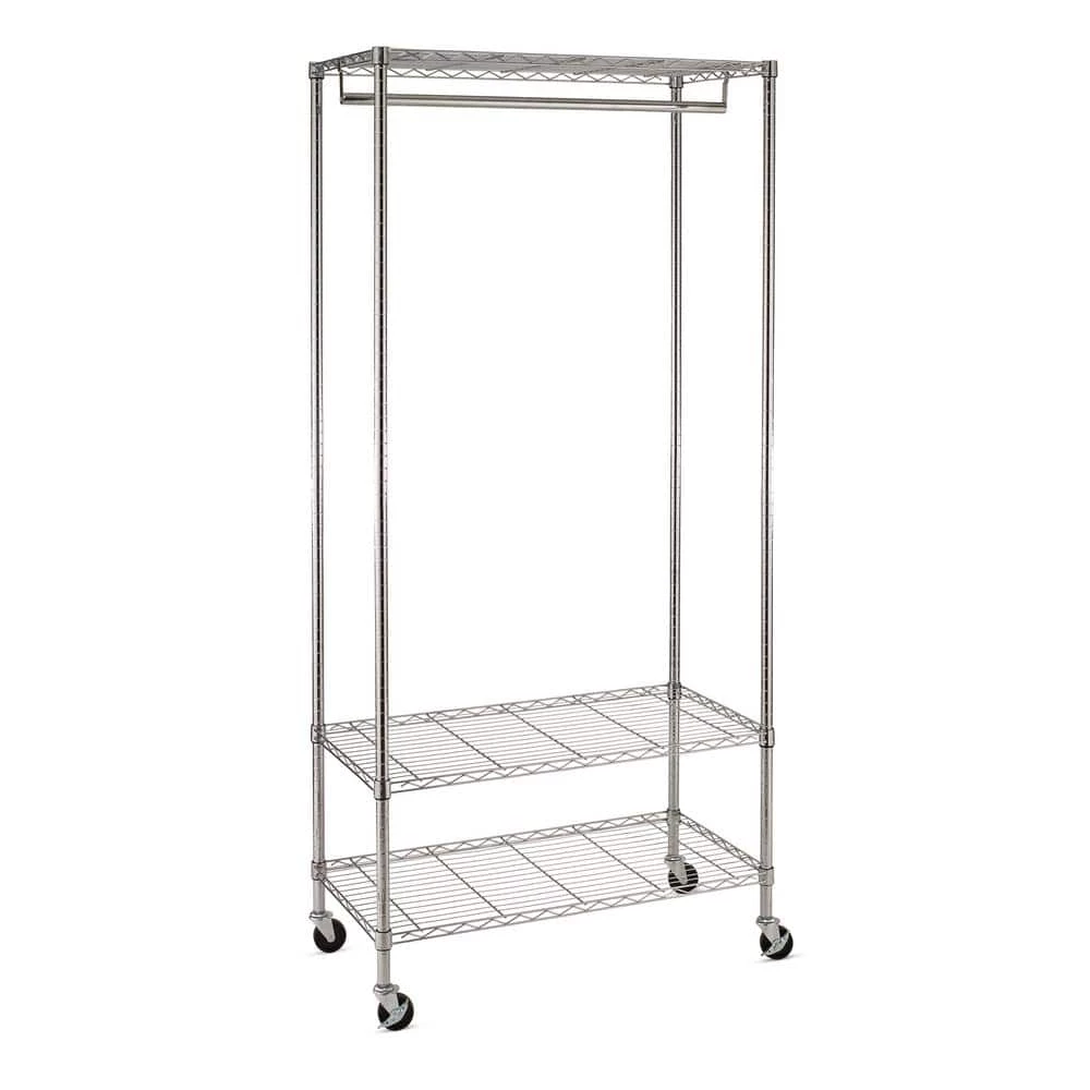 This sturdy garment rack is made from steel and goes from room to room on smooth rolling swivel casters that easily lock in place. A hanging bar provides 35 in. of hanging space with a 50 lbs. weight capacity. 3 shelves adjust in 1 in. increments to provide additional storage, each with a 200 lbs. weight capacity. A great storage solution for the laundry room or housing out-of-season clothing.