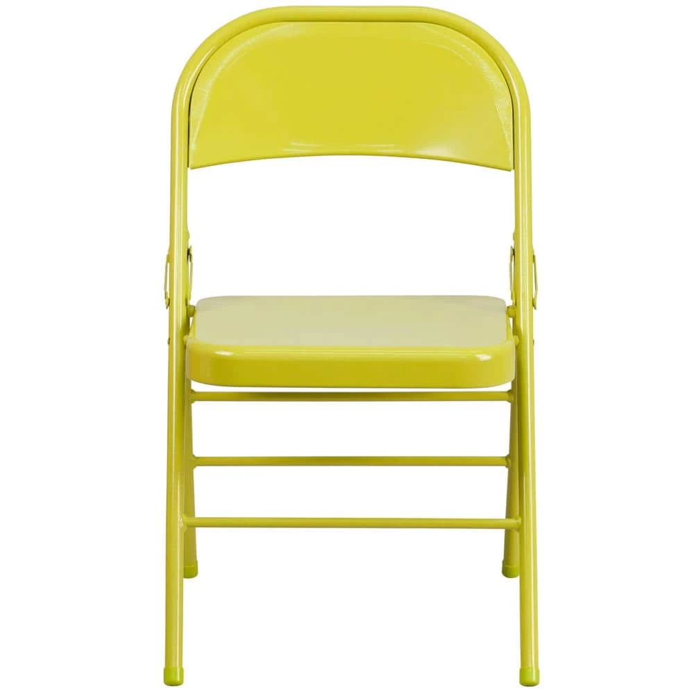 This metal folding chair is a colorful option for everyday use or when you need extra seating in a residential or commercial location. It features a premium 18-Gauge, curved steel frame. Though lightweight and easy to fold, transport and store, this chair is sturdy enough to hold up to 300 lbs. The legs are triple braced, with an integrated foot rest, and Double Hinged with Riveted steel components. Non-marring floor glides on the legs protect your floors by sliding smoothly when you need to move the chair. Suitable for indoor-outdoor use, these brightly colored chairs are an affordably stylish way to brighten up your home, school or workplace.