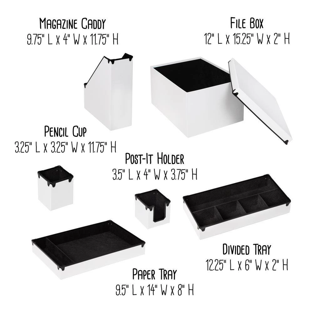 - Dimensions- Magazine Caddy: 9.75 in. L x 4 in. W x 11.75 in. H; Pencil Cup: 3.25 in. L x 3.25 in. W x 4 in. H; Divided Tray: 12.25 in. L x 6 in. W x 2 in. H; File Box: 12 in. L x 15 in. W x 8 in. H; Post-It Holder: 3.6 in. L x 4 in. W x 3.6 in. H; Paper Tray: 9.5 in. L x 14 in. W x 2 in. H