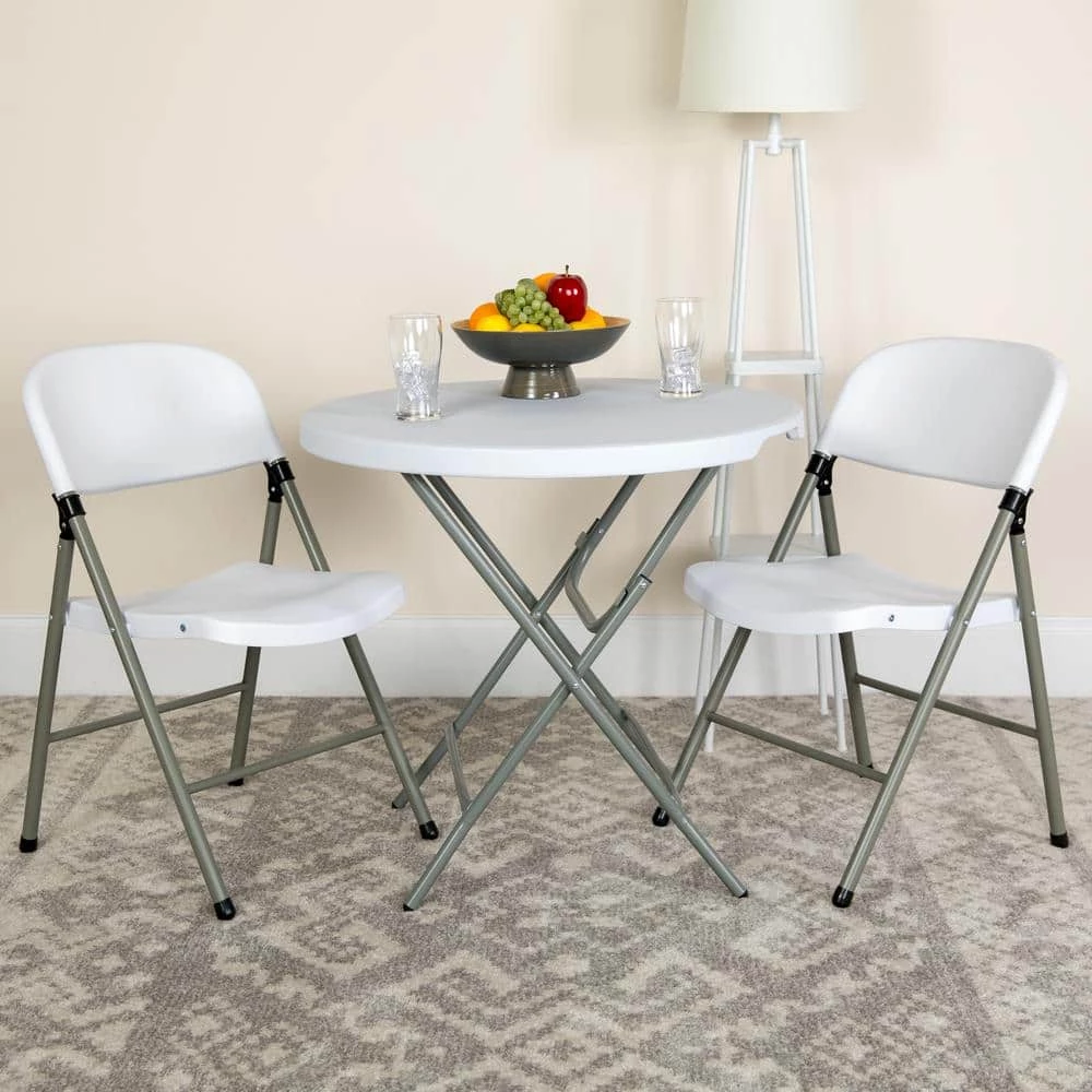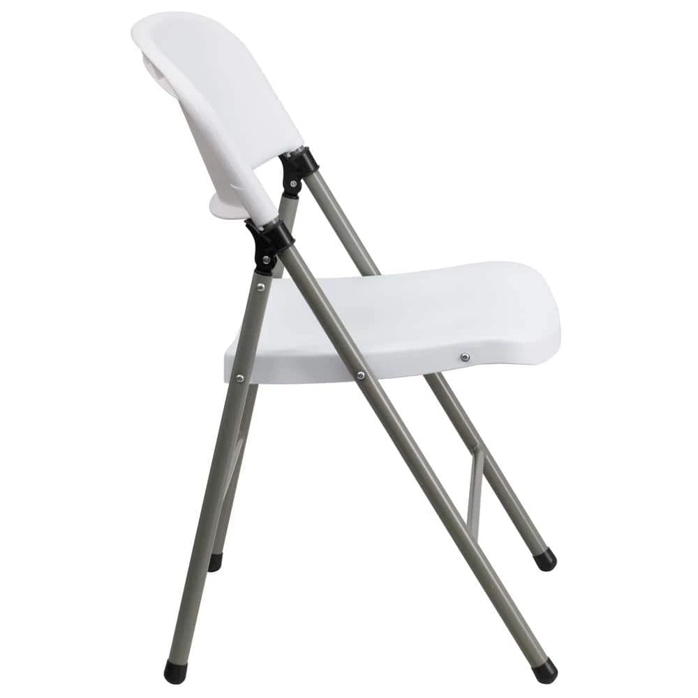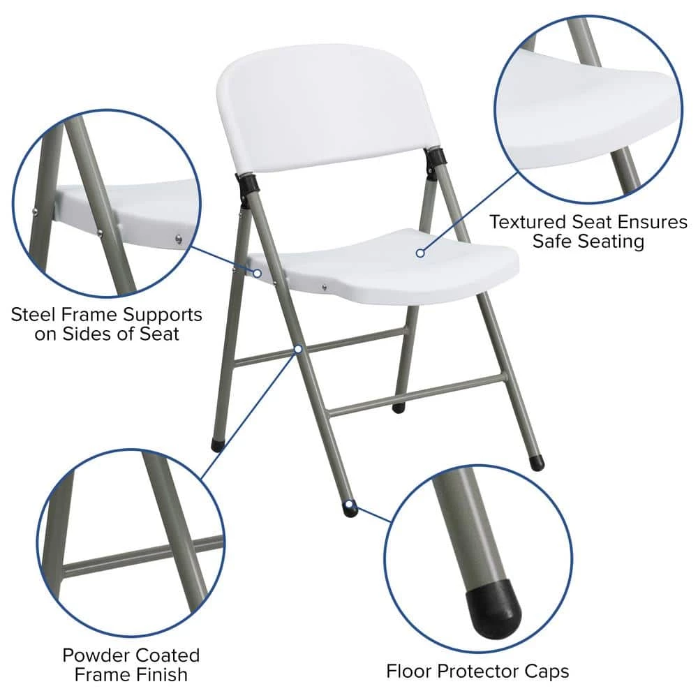 Our 2-pack folding chairs offers a perfect seating solution for your next event. These chairs offer a simple yet classy addition to any venue and color scheme. Whether you’re setting up a small backyard get-together, a stylish wedding or a large professional corporate function, our lightweight folding chairs help make your next event a breeze. Crafted from steel, our set of two folding chairs boasts a durable frame that can support up to 330 lbs. The body is made from sturdy plastic, with a textured seat for additional seating safety. A gentle waterfall seat edge provides extra comfort and support for your legs, making these chairs a great choice for long events. Enjoy stylish seating that’s ideal for both indoor and outdoor events with these folding chairs. The plastic construction can be quickly wiped off in the event of dirt or rainfall, making them extremely easy to clean. For indoor events, the protective foot caps ensure the seat stays firmly in place and doesn’t scratch your floors. When not in use, the lightweight design makes it easy to transport and store your folding chairs. Discover an effortless seating solution for any event with these plastic folding chairs.