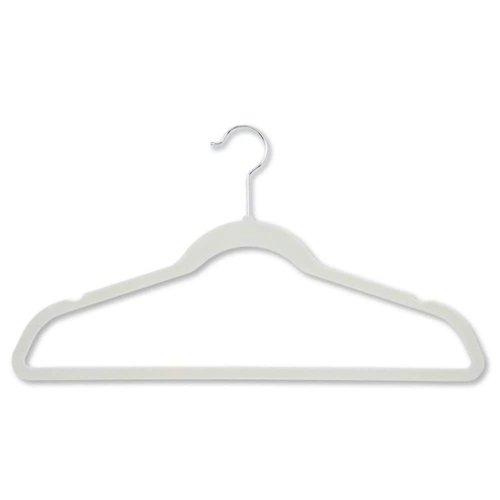 Honey-Can-Do HNG-01051 20-Pack Velvet Touch Suit Hanger, Ivory. Beautiful, soft, and durable this clothes hanger is contoured to keep shirts, dresses, jackets, and pants perfectly wrinkle-free. Features a 360° chrome, swivel rod hook to hang items easily on any closet rod, towel bar, or standard size door. Durable metal construction provides strength, reliability, and long-lasting beauty. Soft velvet coating is gentle on delicate garments and provides a non-slip surface that holds fabrics beautifully in place. Slim, space-saving design makes the most use of available hanging space with its 1 or 4 profile.