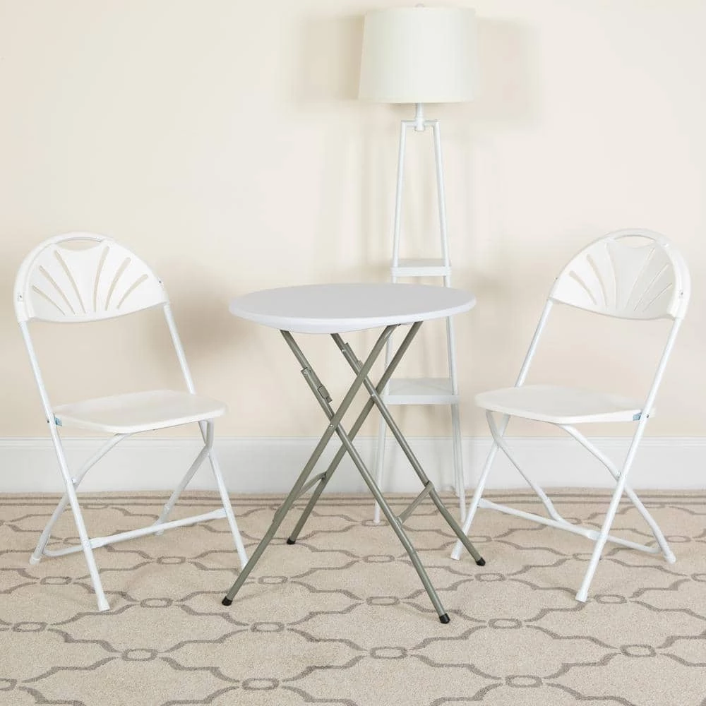 This elegant 650 lbs. Capacity Plastic Fan Back Folding Chair will provide a modern seating solution to any setting. These portable chairs fold compactly to stack/nest on top of each other or to easily transport from place to place. Fan back chairs are a great option for event planners as they can be used without the need of chair covers. The seat and back are textured and contoured for comfort. Drain holes in the seat keep water from pooling when the chairs get rained on. The 18-Gauge steel frame with leg strengthening double support rails gives this lightweight chair the strength to hold up to 650 lbs. Non-marring floor caps on the legs protect your floors from scuffs and scrapes by sliding smoothly when you move them. The versatile fan back banquet folding chair will be your go-to chair for indoor and outdoor party events.