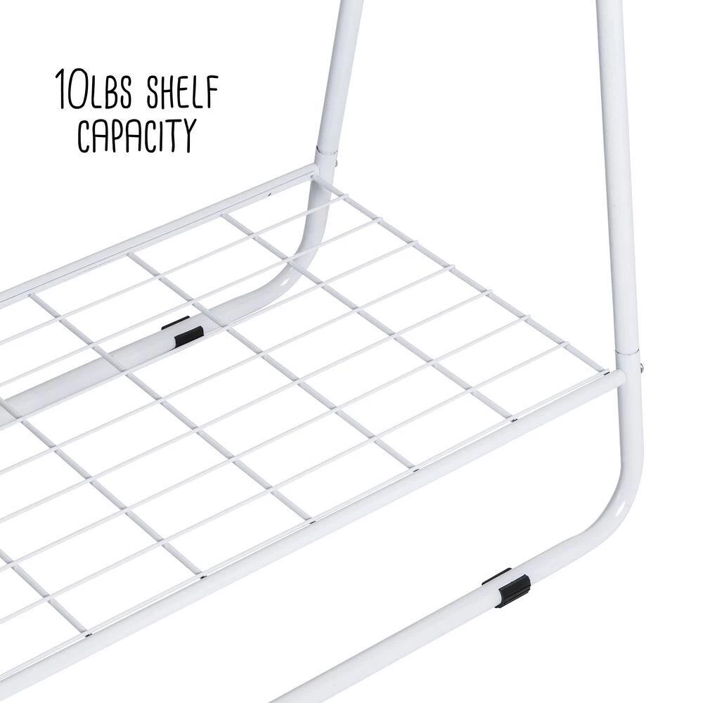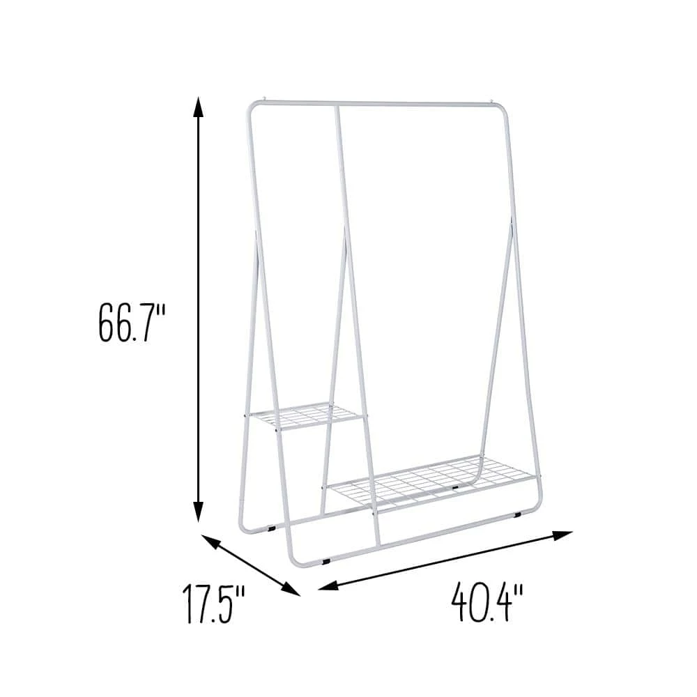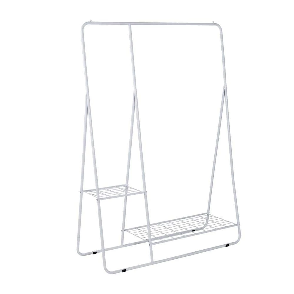 Clean lines, a sturdy frame, and modern silhouette. This versatile and minimal white clothing rack is a blank canvas ready to organize and show off your wardrobe. The sleek A-frame silhouette features two open wire shelves that craft a sturdy base for this clothing display while giving extra storage options. Try fitting the bottom shelf with storage baskets for belts, scarves, and accessories. Then add some flair by using the higher shelf for a small potted plant. Or, simply use both shelves as shoe racks-it’s all up to you. You can even skip the clothes and use this clothing organizer as an eye-catching and modern plant stand instead. The all-metal build holds up beautifully to humidity and water. Plus, there is plenty of room for both hanging and stationary plants with the hanging bar and shelves. The beauty of garment racks is that they can be curated a million different ways-and this stunner is ready for you to give it your personal touch.