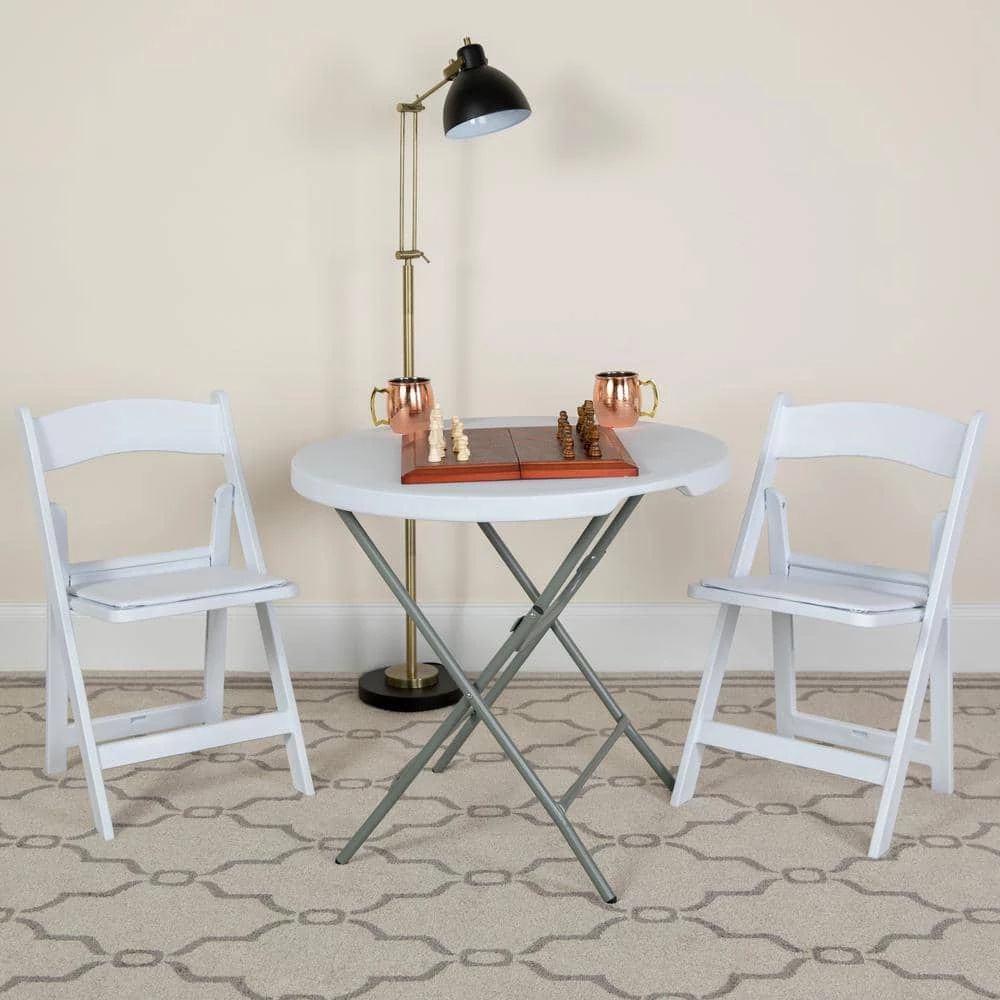 The White Resin Folding Chair combines comfort and elegance that looks good at all your special events, whether it’s a backyard barbeque, a formal banquet or beach wedding. This chair is made from ultra-strong resin that’s very lightweight, yet extremely strong and can hold up to 1000 pounds making this portable folding chair perfect for any social event, your home office or remote learning space. The smooth frame is double braced for added stability and the front brace can be used as a footrest. The color of the frame is the same all the way through, so you don’t have to worry about nicks and scratches. No re-painting or staining is ever needed; your chairs will look great for years to come. The chair comes with a detachable, washable, waterproof seat cushion filled with fire retardant foam. The easy to clean, durable design of these chairs makes them the ideal choice for indoor and outdoor use. The chairs are portable and fold compactly to transport and store.
